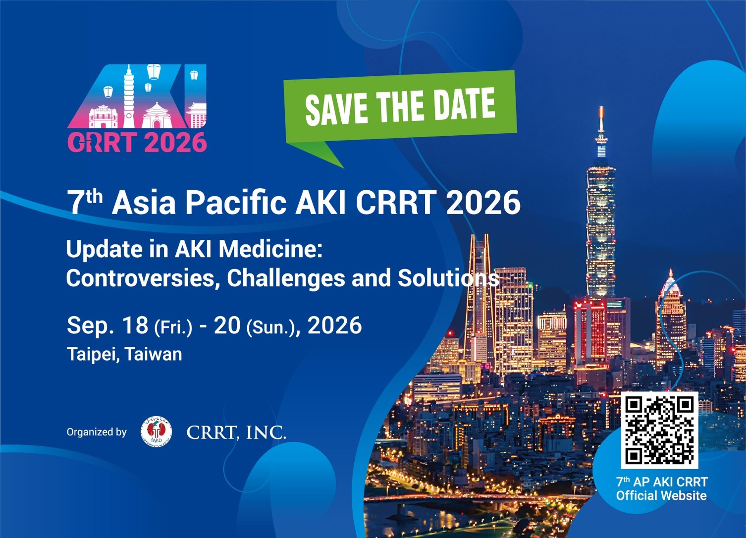 It is our great pleasure to announce that the 7th Asia Pacific AKI CRRT Congress 2026 (AP AKI CRRT 2026) , is scheduled to take place from Sep 18 (Fri) to Sep 20 (Sun), 2026, in Taipei, Taiwan.
